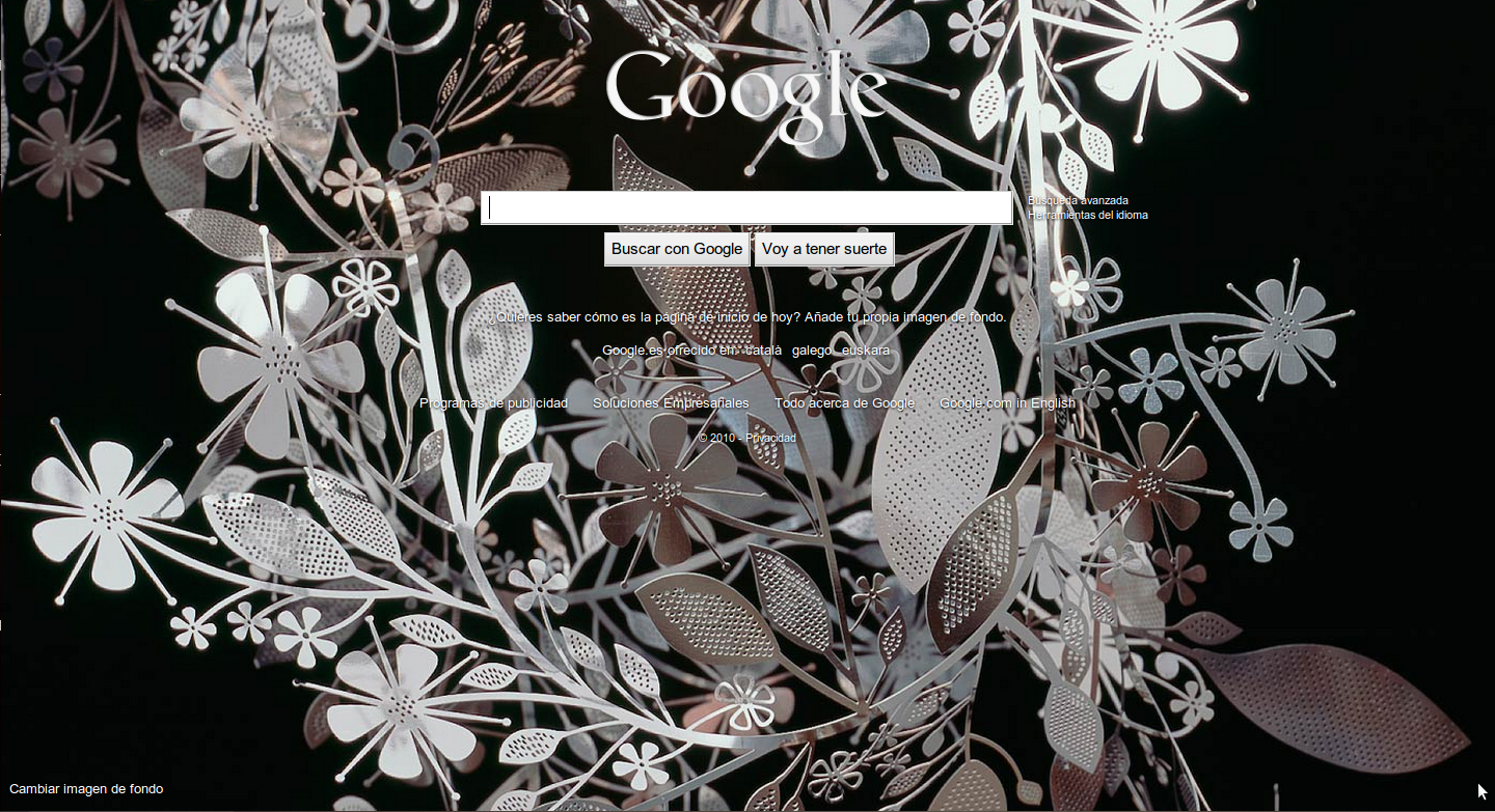 ¡¡ Aaarrrggghhh !!. No solamente no me gusta nada el tener un fondo diferente al blanco en el buscador sino que ademas el fondo que han elegido hace completamente ilegible la letra pequeña de la página. Abajo, a la izquierda, hay una opcion para personalizar el fondo que permite elegir una foto propia o seleccionar entre otras subidas por otros usuarios, pero no permite (o no he encontrado) como dejarlo como estaba.
